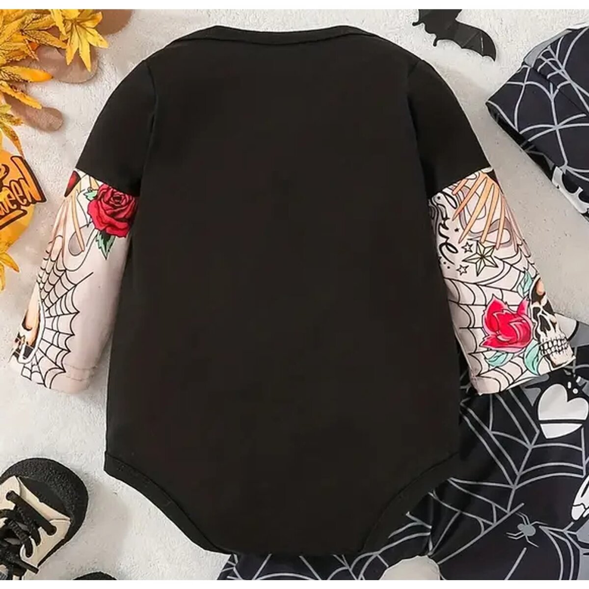 Das absolute Highlight: Die langen Ärmel sind bunt bedruckt mit Totenköpfen, Rosen und Spinnennetzen auf hautfarbenem Hintergrund. So sieht es aus, als hätte Dein Baby schon jetzt coole Tattoo-Ärmel – ganz ohne Nadel, aber mit jeder Menge Spaß!