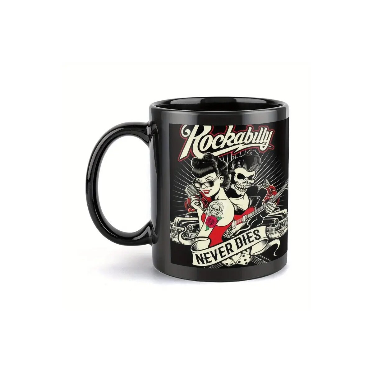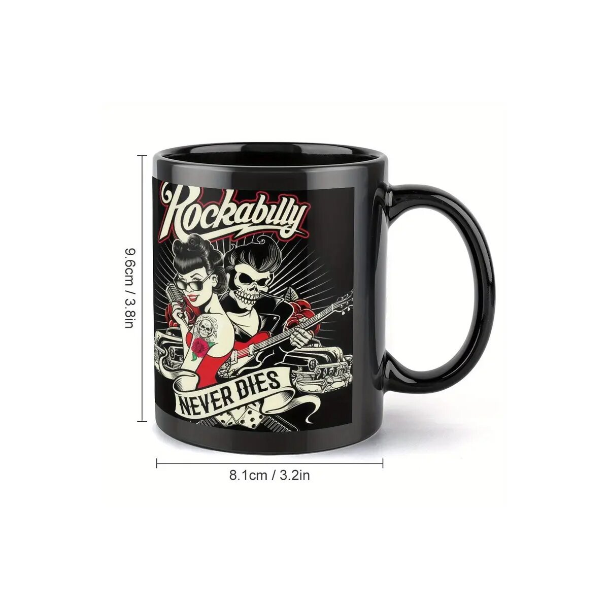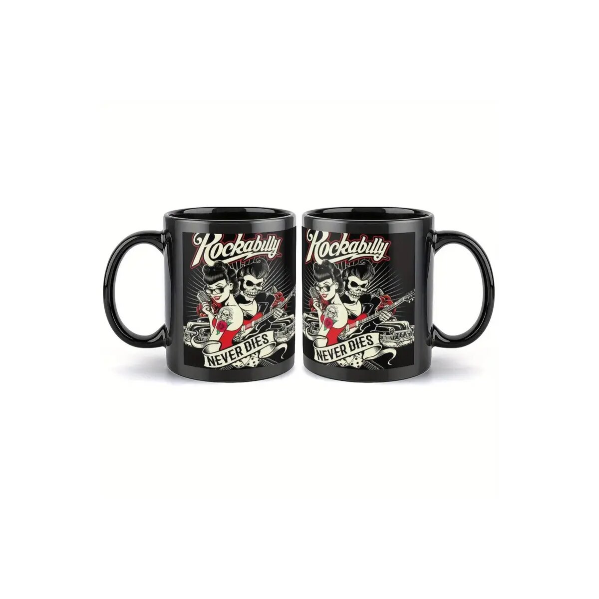 Starte deinen Tag so wild und unvergänglich wie deine Liebe zum Rockabilly! Mit dieser schwarzen Keramiktasse hältst du nicht nur dein Koffein, sondern auch den rebellischen Sound der 50er Jahre fest in der Hand. Die typische Rockabilly-Grafik wird von einem kraftvollen Schriftzug gekrönt: Rockabilly – NEVER DIES.