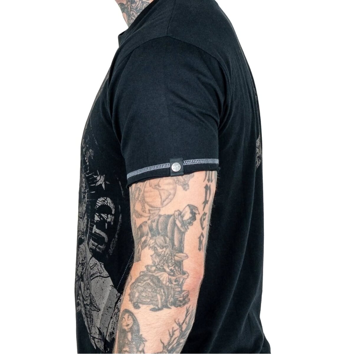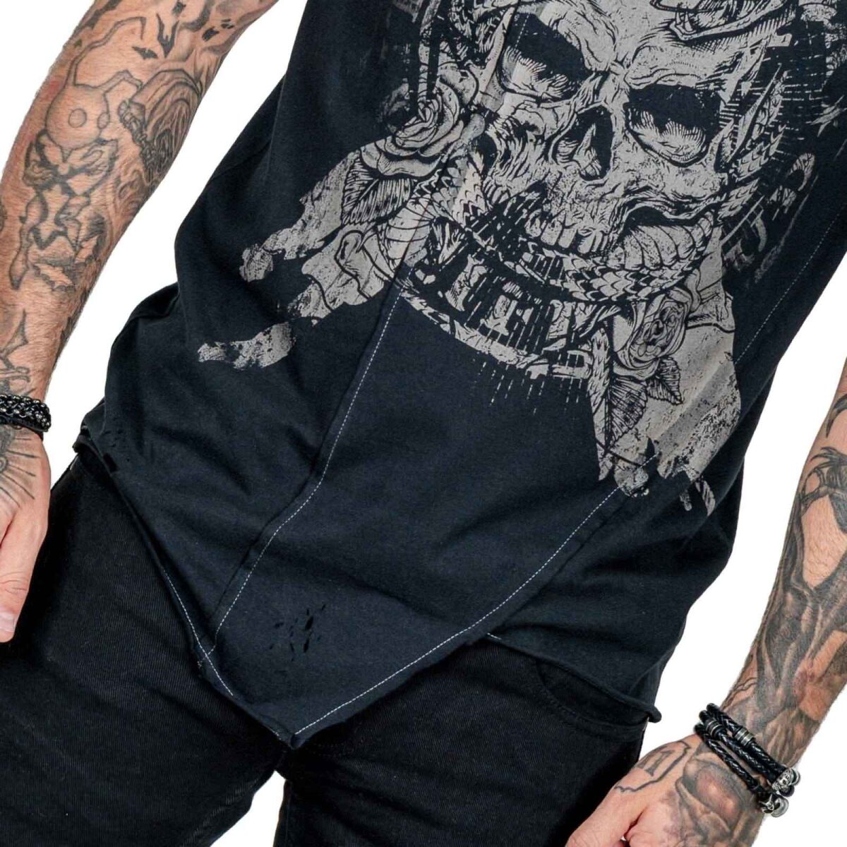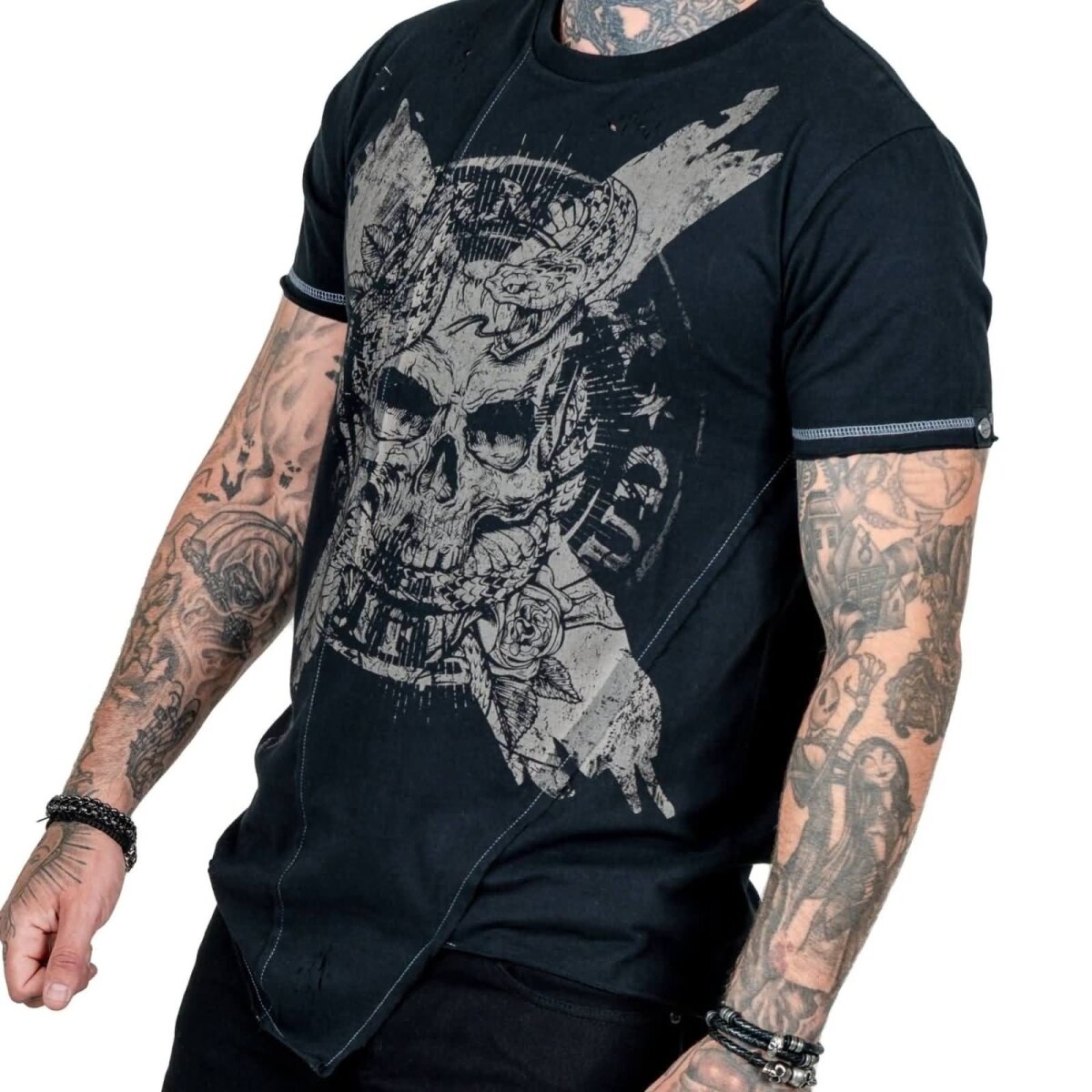Dieses einzigartige Shirt aus der Artist Asylum Serie vereint Stil und Komfort wie kein anderes. Aus 100% vorgewaschener, superweicher Baumwolle gefertigt, besticht es durch sein asymmetrisches Patchwork-Design mit Kontraststichen und Used-Look-Grafiken.